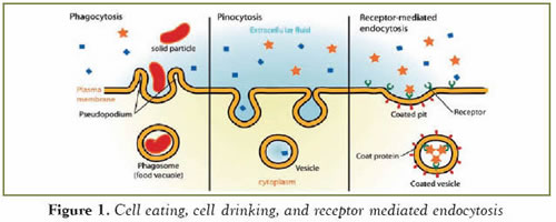 For the sake of simplicity, the very complex - yet flawless - organization of a single cell can be portrayed as a city. Even in a very small city that has a relatively low population there are different establishments of various sizes and capabilities that work in concert. Likewise, in order to keep the cell alive the intracellular organelles and proteins of a cell complement each other's functions. Even though the majority of cities may have the resources to supply themselves, they also need to import and export goods. In addition, some cities may have greater industrial, residential, or agricultural strengths, making it necessary for it to communicate and trade with neighboring towns to eliminate shortages. In a similar way, cells have to communicate with neighboring cells, and bring in new sustenance and get rid of waste at different stages in their life cycles. In this article we will focus on one of the key elements of the import mechanism that is used by living cells, endocytosis.