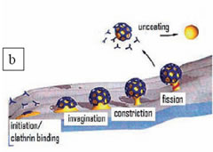 Endocytosis is the process by which cells take in substances from outside. Since living cells are surrounded by a membrane, the cargo molecules, which are too large to penetrate through the membrane, have to be internalized by different means; this can be classified as Cell eating (i.e. phagocytosis: the endocytosis of large solid materials), cell drinking (i.e. pinocytosis: the endocytosis of liquids in large amounts) and receptor mediated endocytosis (the internalization of molecules that have specific receptors on the cell membrane) (Figure 1). During the course of these events, the portion of the cell membrane that surrounds the cargo is also internalized. However, at the present time, very little is known about the mechanisms that cause the cell membrane to invaginate and eventually be pinched off during the onset of endocytosis. Here we will concentrate on receptor mediated endocytosis, which has been intriguing biologists for more than three decades now.